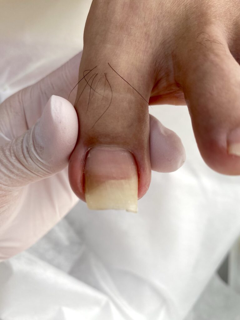 写真のようなデリケートな状態の爪でも、専門知識と豊富な経験を持ったスタッフが、痛みに最大限配慮しながら丁寧にケアを行います。
